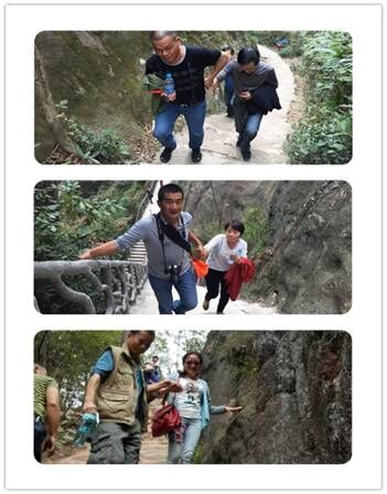 都说上山容易下山难;上山时觉得陡,重心下低可劲的爬,下山再走这时才体会到话里的意思,有些女同事是边扶着山石边举步下山的,像是生怕冲到路边的深山沟似的。此刻的同事友爱同样没能少,一身探险运动装束的戴总也伸出了友爱的手,一米八的个头侧身抬手带些陈月花下完这段最险而风景也是最美的路段,两人为我们也展示了传说的“最萌身高差”。