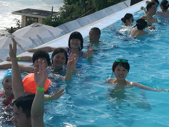 蓝蓝的海岸边,浪一层比一层高,拍打在白白的沙滩上,不少外国人在冲浪,沙滩上也有不少人玩沙和晒着日光浴……有会游泳的同事已兴奋的去海浪中戏嬉,而我这样的“旱鸭子”只能留在这海岸上的无边泳池中戏水了!