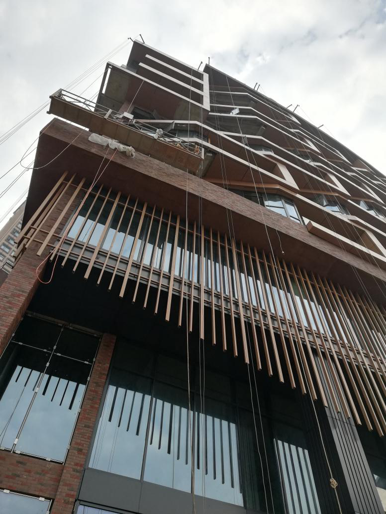酒店楼栋,建筑外型最为复杂,曲面的整体立面,像似环环相扣而造型变化多变,工人们通过吊蓝作业,一点一处的拼装到位,考验着建设和管理者的信心。