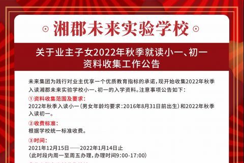 未来集团为践行对业主优享一个优质教育指标的承诺,现开始收集2022年秋季入读湘珺未来实际学校小一、初...